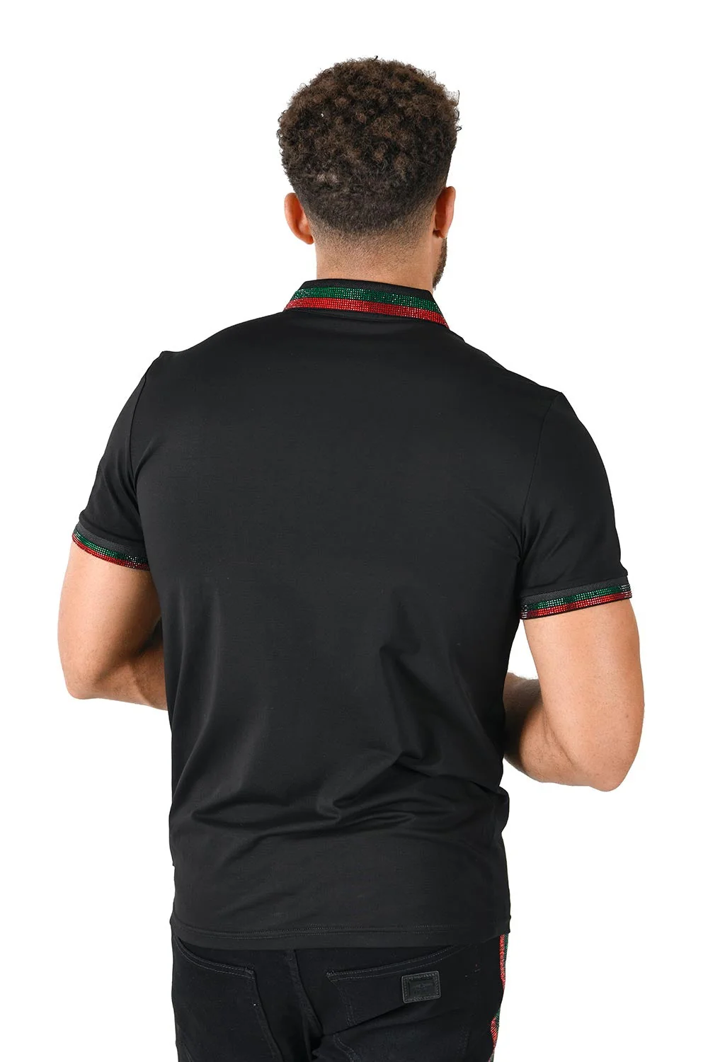Barabas men's green and red rhinestone short sleeve polo shirts are a game-changer in the fashion world. It has an original design, red and green rhinestone on the collar and sleeves.